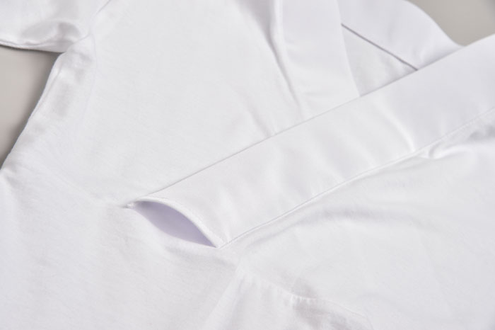 生地感はTシャツと同様綿素材ですので、洗濯機で洗えてアイロンもかけられます。 衿はポリエステル素材で型崩れや変色が起きにくい。
