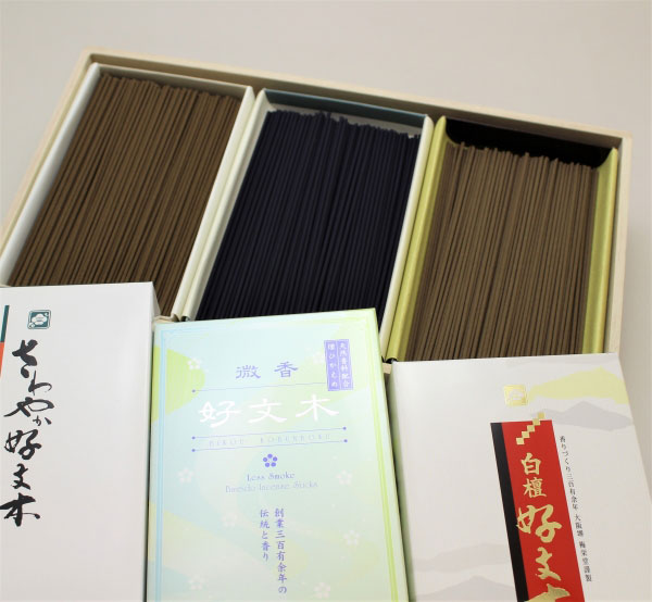 実用線香詰合せご進物。「名香かおりくらべ」さわやか好文木・微香好文木煙控・白檀好文木各平型バラ桐箱入り。熨斗紙の表書き、ご進物用包装も無料で承っています。
