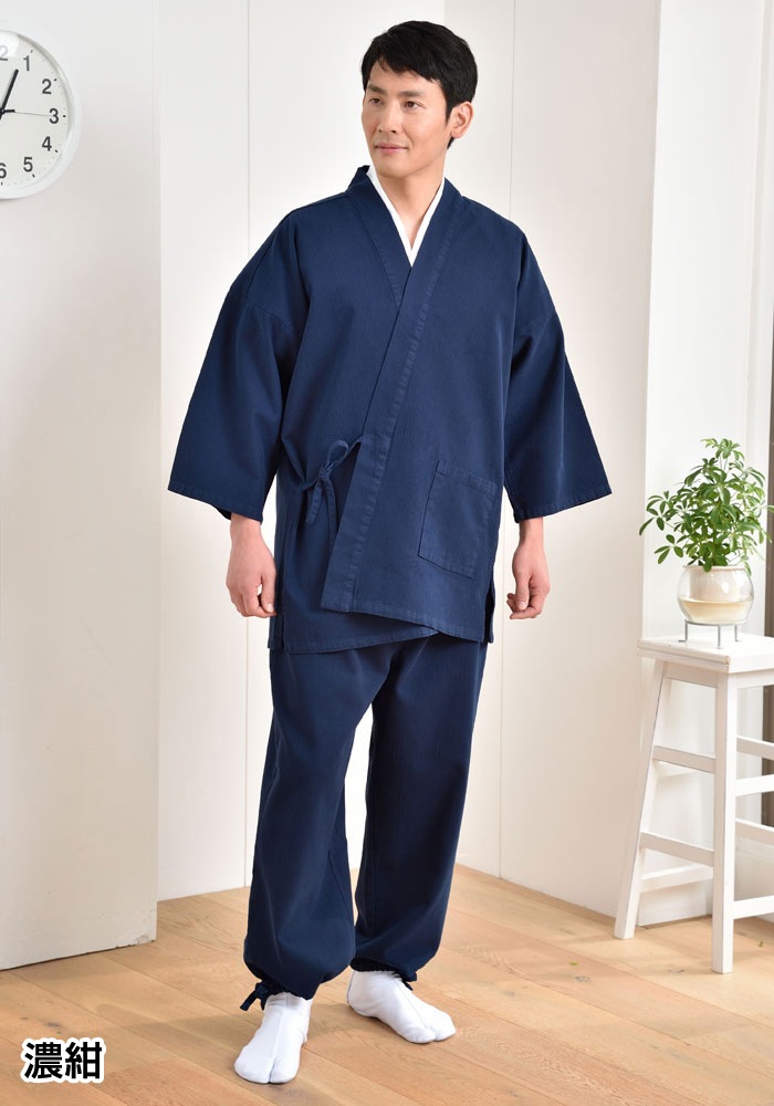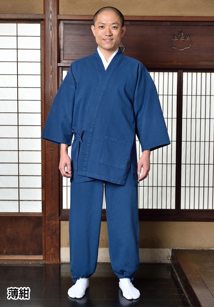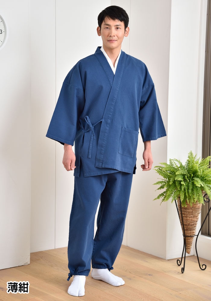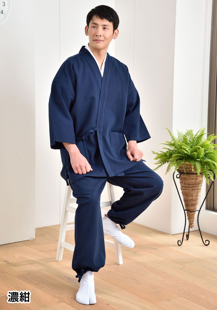 肉厚生地で着ごたえ充分。春秋に盤石の活躍を魅せる正統派な作務衣。